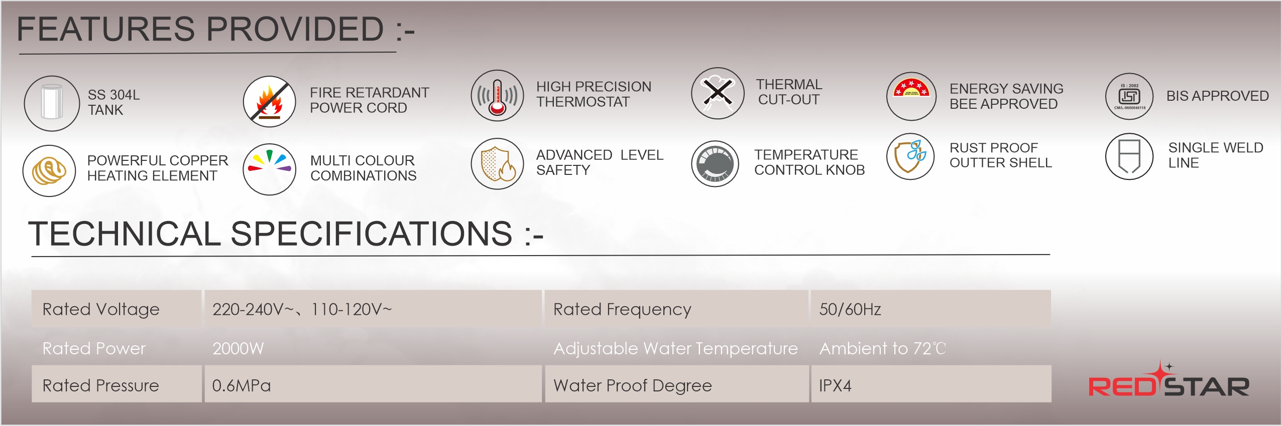| Power / Voltage | 2000W | 230V AC, 50 Hz |
